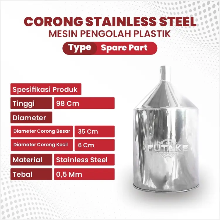 Futake Indonesia merupakan perusahaan manufaktur yang berfokus pada produk turunan logam hingga mesin sampah. Salah satunya adalah hopper stainless steel industri, seperti untuk pengolahan biji plastik hingga plastik daur ulang.